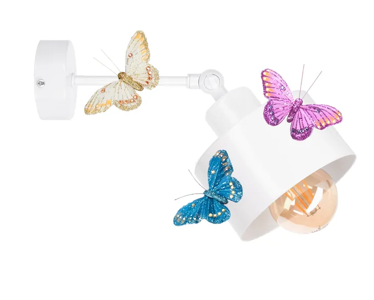 Dodatkową ozdobą lampy są 3 eleganckie motyle (rewelacyjnie wykonane, wyglądają jak żywe). Motyle posiadają magnes, dzięki czemu można je umieszczać w dowolnym miejscu na lampie. Motyle są wykonane z lekkiego materiału, strukturą przypominającego ptasie pióro. Dzięki temu nie zagrażają bezpieczeństwu Twojej pociechy (w razie odczepienia się od lampy).