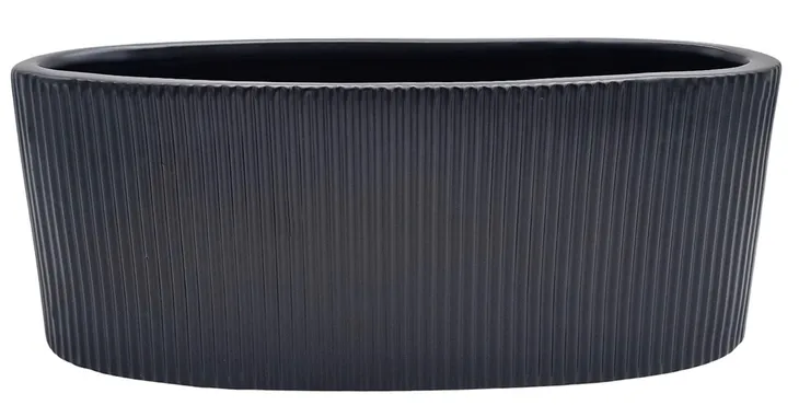 Elegancka osłonka ceramiczna w kolorze czarnym o nowoczesnej, owalnej formie. Powierzchnia osłonki zdobiona jest delikatnym pionowym ryflowaniem, które nadaje jej subtelnej struktury i minimalistycznego charakteru.