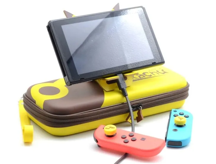 - Z zestawie znajduje się podstawka z drewna imitująca postać Pikatchu oraz smycz w piorunem + nakładki na Joy-Con-y