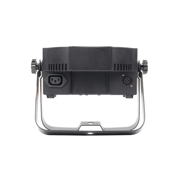 - Wejście/Wyjście zasilania oraz DMX są umieszczone na panelach bocznych by móc ustawić urządzenie bezpośrednio na podłożu